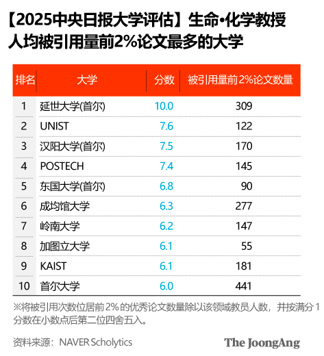 在衡量学术影响力的“生命·化学教授被引论文”排名中,延世大学(首尔)荣登榜首,并以满分成绩遥遥领先。这充分证明了其研究成果所获得的超高国际认可度与引文影响力。