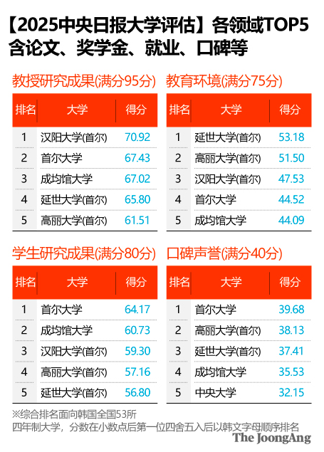 韩国《中央日报》正式发布了“2025年大学评估综合排名”! 本次评估中,除持续领跑的首尔大学、延世大学(首尔)、成均馆大学等顶尖学府外,以“实用学风”著称的汉阳大学(首尔)跃居第三,表现尤为亮眼。 图源:《中央日报》 韩国中央日报大学评估综合排名面向涵盖人文、社会、自然科学、工学等全领域的综合性大学,旨在评估其研究、教育、声誉等维度的整体实力。 今年,除了大家耳熟能详的首尔大学、延世大学(首尔)、成均馆大学等韩国知名高校仍然占据榜单前列外,以“实用学风”闻名的汉阳大学(首尔)也展现出强劲的发展势头!这也让我们看到,韩国优秀的大学真的各具特色,值得我们一起深入了解。 在各分项排名中,顶尖学府同样展现了非凡实力。 具体来看,汉阳大学在教授研究成果维度中,荣登全韩第一。延世大学(首尔)凭借其在教育环境上的卓越表现,位居该维度榜首;而在学生研究成果与口碑声誉两项关键指标中,首尔大学则独占鳌头,凸显了其全面的领先地位。 图源:《中央日报》 不过选校可不能光看排名,你的分数和背景能冲哪所?每所学校的王牌专业是啥?