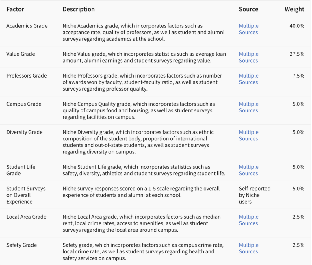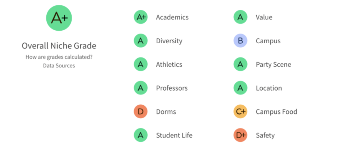 学生评价在Niche的排名中占据了重要地位。除了5%来自于学生调查问卷给学校的打分,其他所有指标也都有参考学生对学校相应部分的评价。