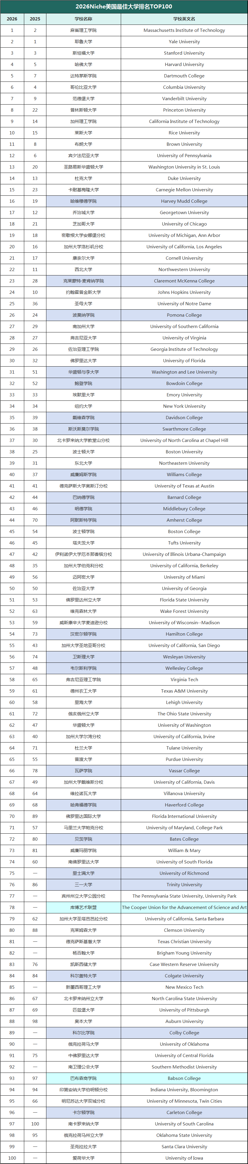 不少备受赞誉的文理学院也名列前茅,比如哈维穆德学院位列第16名、克莱蒙特麦肯纳学院位列第23名、波莫纳学院位列第26名。