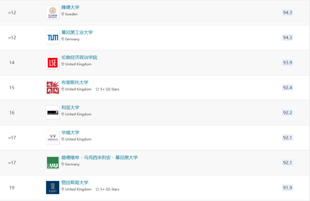 德国高校有15所进入前100名,排名最高的依然是慕尼黑工业大学第12名。