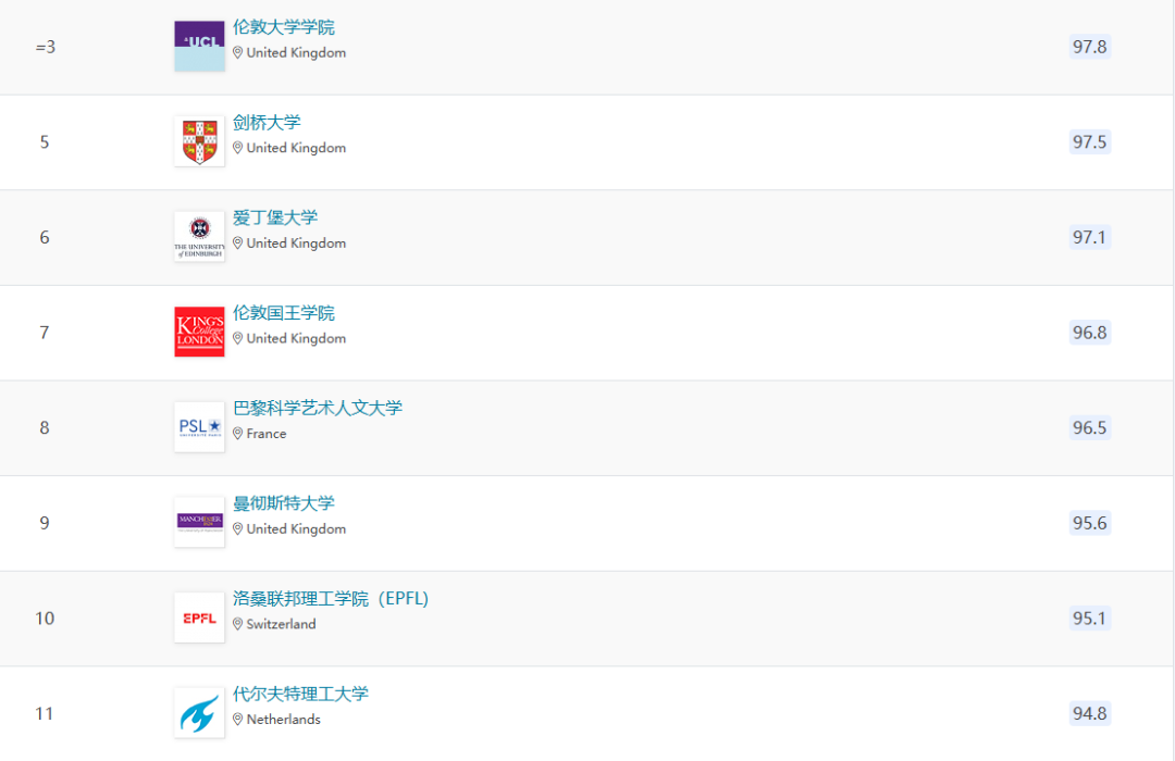 荷兰10大学所进入欧洲前100,整体表现亮眼,排名最高的是位列第11名的代尔夫特理工大学。