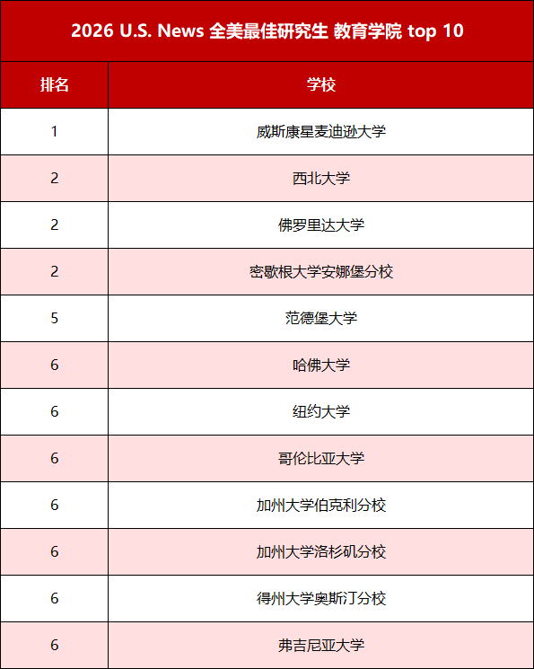 教育学院排名变动显著,共计12 所院校跻身前十,7 所院校并列第六位: