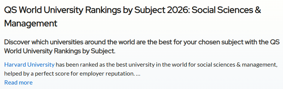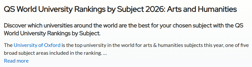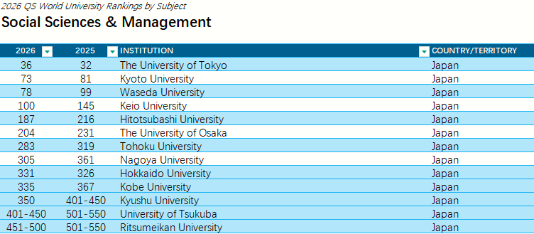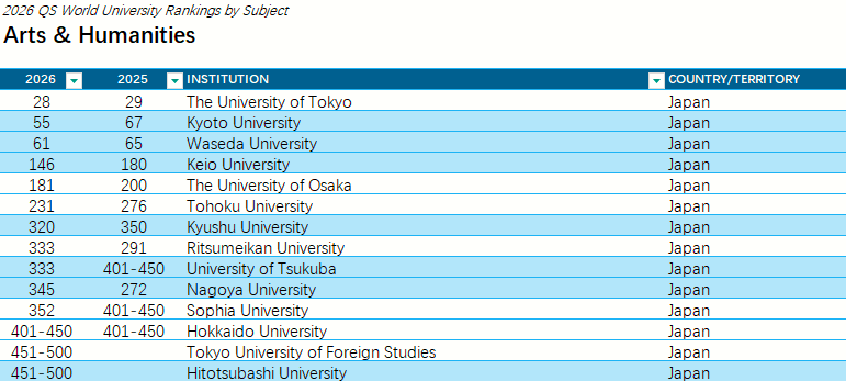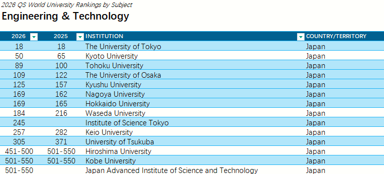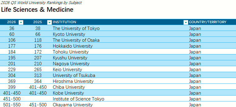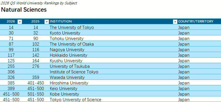 全球关注度最高的QS世界大学发布了“2026QS世界大学学科排名”结果!本次排名涵盖了来自100多个国家和地区的1900多所大学的21000多个学术项目,跨越55个学术分支和五大广泛的学术板块:艺术与人文、工程与技术、生命科学与医学、自然科学、社会科学与管理。 图源:topuniversities.com 每一个学科排名都由五个指标组成:学术声誉、雇主声誉、篇均论文引用率、H指数、国际研究网络,根据每个学科调整权重。 其中日本各大学学科排名在榜单中表现怎样呢?从这份榜单来看,在细分的55个学科中日本大学位于世界大学排名前10的有: 东京大学的物理学・天文学(世界大学8位、日本1位) 东京医科齿科大学(现东京科学大学)的牙科学(世界大学9位、日本1位)