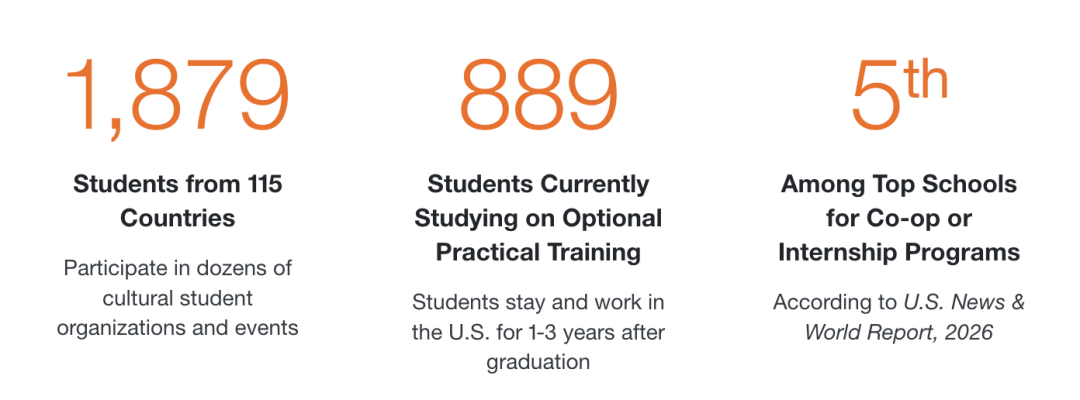 校园位于雪城市中心附近,秋季景色优美,冬季则以大雪闻名。学校拥有超过300个学生组织,提供丰富的课外活动和领导力发展机会。毕业生就业率高达90%以上,平均起薪在$65,000-$75,000之间,主要雇主包括亚马逊、谷歌、德勤等知名企业。