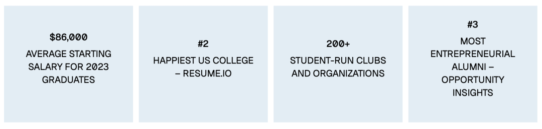 根据上图显示,伦斯勒理工(RPI)2023届毕业生平均起薪为86,000美元,美国最幸福的大学排名第二、拥有200+学生运营的俱乐部和组织、最具创业精神和机遇洞察的校友数量是全美第三。