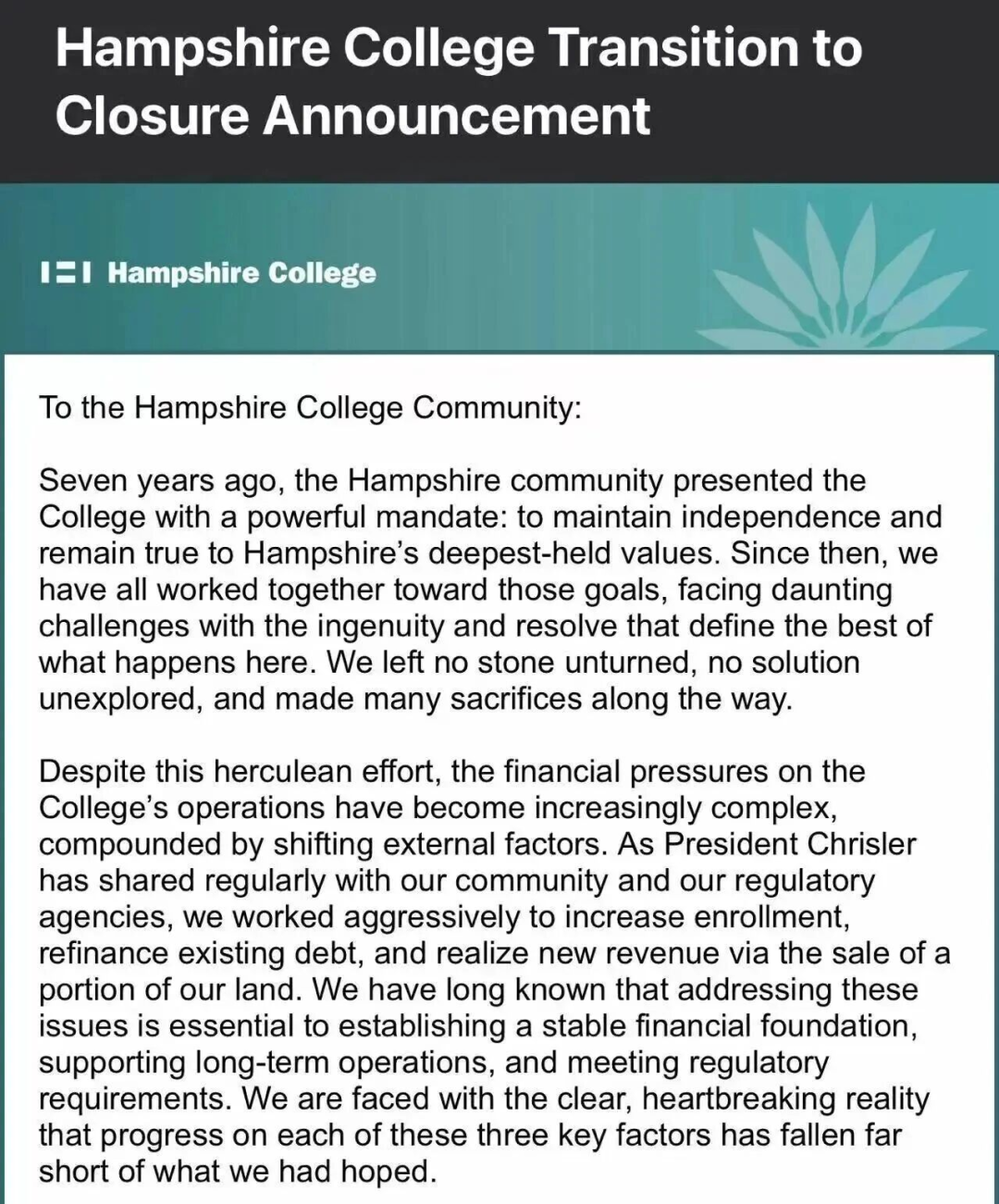 美国大学罕布什尔学院宣布关停
